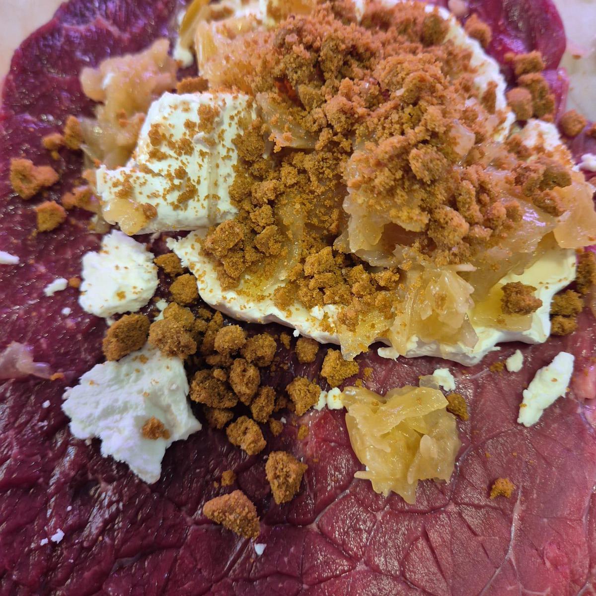 CACHOPO RELLENO DE RULO DE CABRA ,CRUJIENTE DE LOTUS Y CEBOLLA CARAMELIZADA